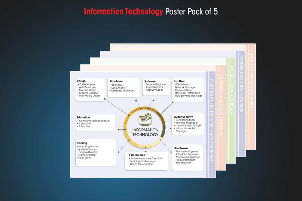 Our IT pack 5 A2 Poster files;5 A3 Poster files and 2 Roll Up Banner files covering Information Technology, Computer Games, Mobile Apps, Cyber Security and Graphic Design. With some of the latest career titles to explore, this set is a must for any IT department looking to help students explore careers in these subjects and get engaged about a career in the industry.