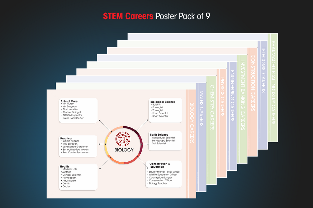 This STEM set contains 9 A2 Poster files; 9 A3 Poster files and 3 Roll Up Banner files covering careers from maths, biology, chemistry, physics, engineering, construction, Pharmaceutical Industry, Investment banking, Telecoms