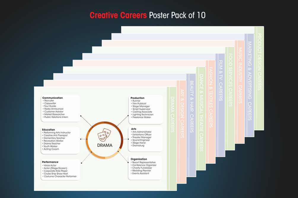 This poster pack of 10 contains 10 A2 Poster files;10 A3 Poster files and 3 Roll Up Banner files covering some of the more creative career subjects taught in many schools. The creative careers set contains beauty & hair, dance & musical theatre, drama, fashion & textiles, film & tv, food & drink, music industry, marketing & advertising, product design.